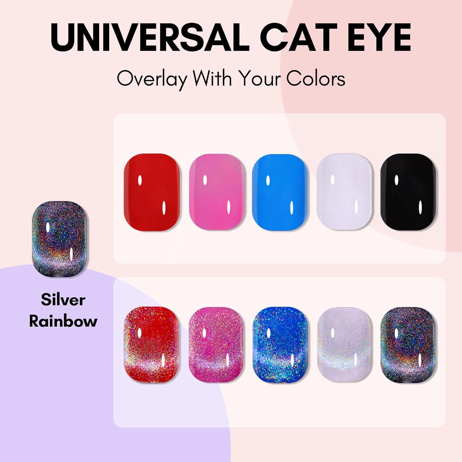 Overlay Different Base Colors: The rainbow holographic 9D cat eye gel polish has a distinctive design that creates a mesmerizing gem nail polish set with different colors of gel polish.Such as blue pink yellow and so on. In fall, you can pair it with nude nail polish, and in winter, you can pair it with brown gel polish. The charming color changing and cat’s eye effect will surprise you