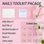 SRIMNUYY Nails Kit:24 pieces of medium square fake nails press ons of different sizes,1 pack of alcohol cotton,1 mini nail file,1 small wooden stick, and 24 piece jelly glue.(jelly glue can last about 3 days or more, glue remains longer)