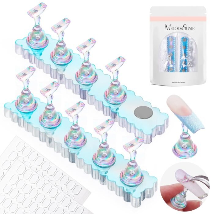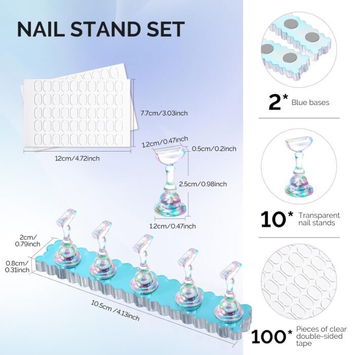 Update MelodySusie Nail Stand Set: Our comprehensive nail stand set includes 2 blue bases, 10 transparent nail stands and 30 pieces of pink reusable adhesive putty or 100pcs of transparent reusable double-sided tape, making it the ultimate solution for all your nail art needs. Please note: old putty and new double-sided tape are being shipped alternatively. Please rest assured the affect remains the same.