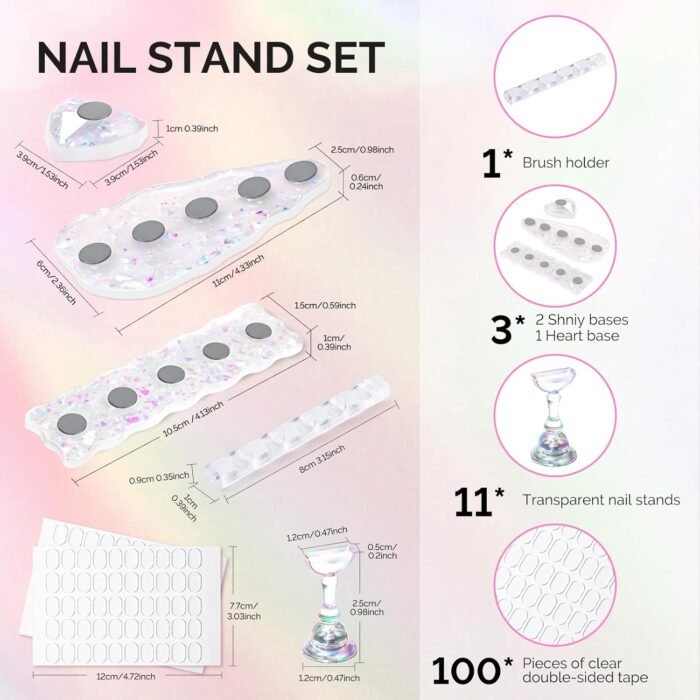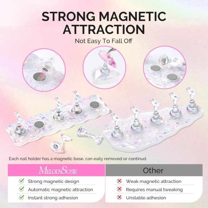 Innovative Magnetic Design: The acrylic strong magnetic nail base allows the nail stands to remain securely upright, making installation and disassembly effortless. This design not only enhances stability but also promotes tidy storage. You can easily place small nail stands in the standard LED/UV lamp, eliminating the need to repeatedly stick your own hand under harmful UV light;