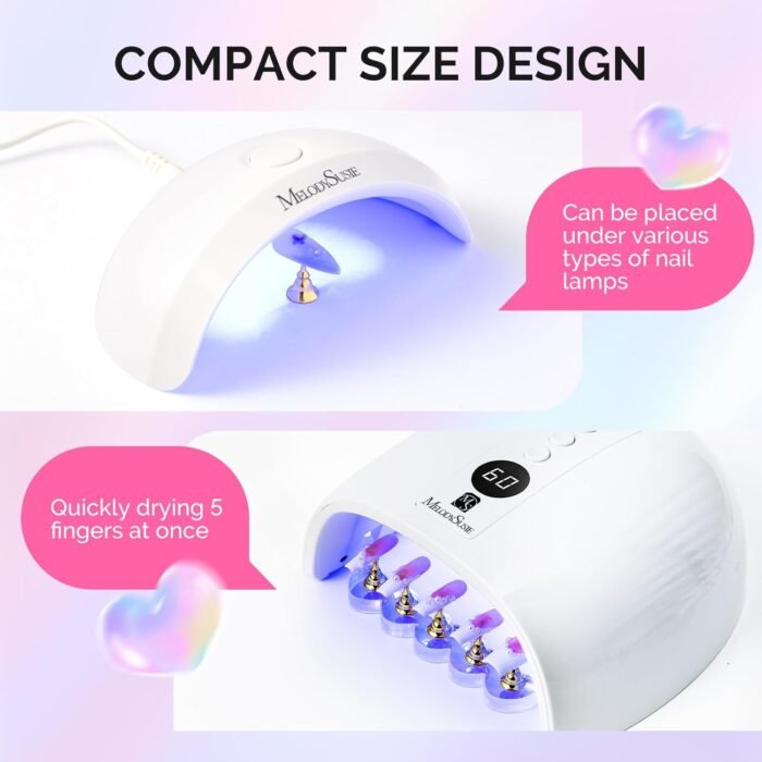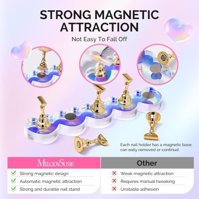 Innovative Magnetic Design: The strong magnetic nail base allows the nail stands to remain securely upright, making installation and disassembly effortless. This design not only enhances stability but also promotes tidy storage. You can easily place small nail stands in the standard LED/UV lamp, eliminating the need to repeatedly stick your own hand under harmful UV light;