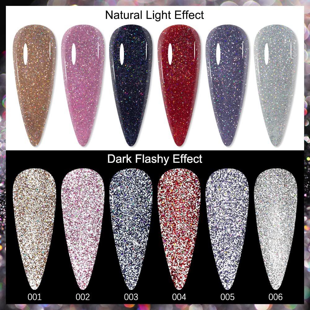 Glitter Gel Polish Collection Set: 6*10ml reflective glitter gel nail polish. Popular 6 colors with rainbow shimmer in 1 kit: cool black, girl pink, charming red, noble golden, classic sliver, special purple