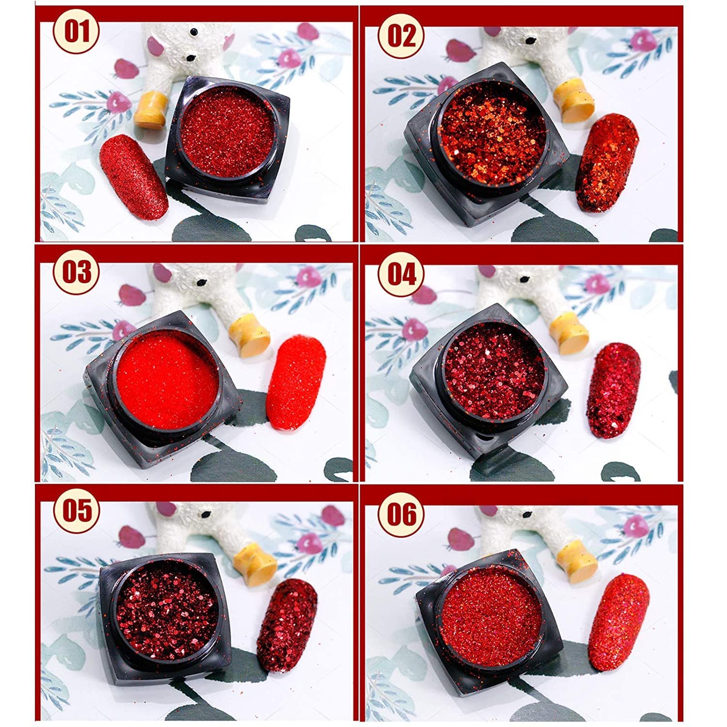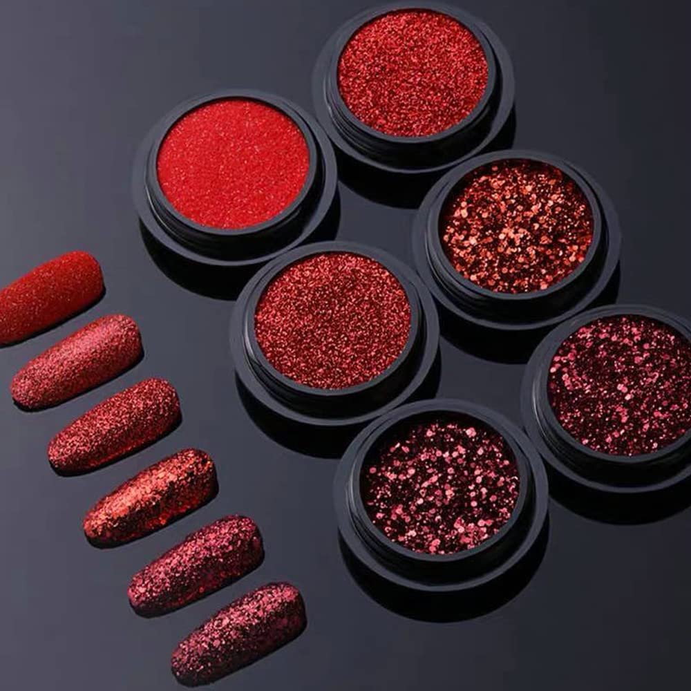 ❤️Packaging: 6 boxes big red nail glitter flakes nail polish , each shape comes with a small plastic box to prevent it from spilling. Enough glitter powder can meet your DIY nail art need.