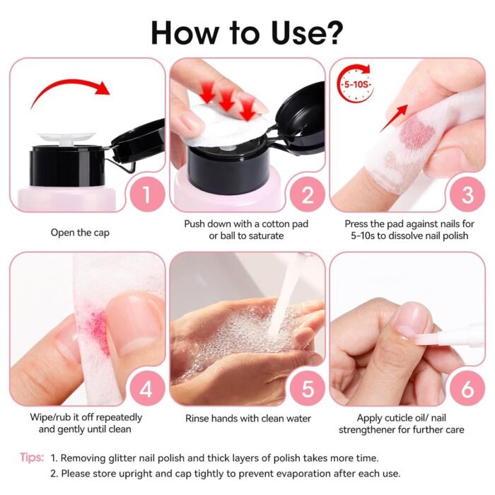 【How to Remove Air-Dry Nail Polish】Press down on the pump head to saturate the cotton pad with nail polish remover. Press it against each nail for 3-10 seconds, then rub it repeatedly until the polish is completely removed. Removing thick / glitter nail polish takes more time. Not intended to remove gel polish or acrylic nails. Always online to answer your questions.