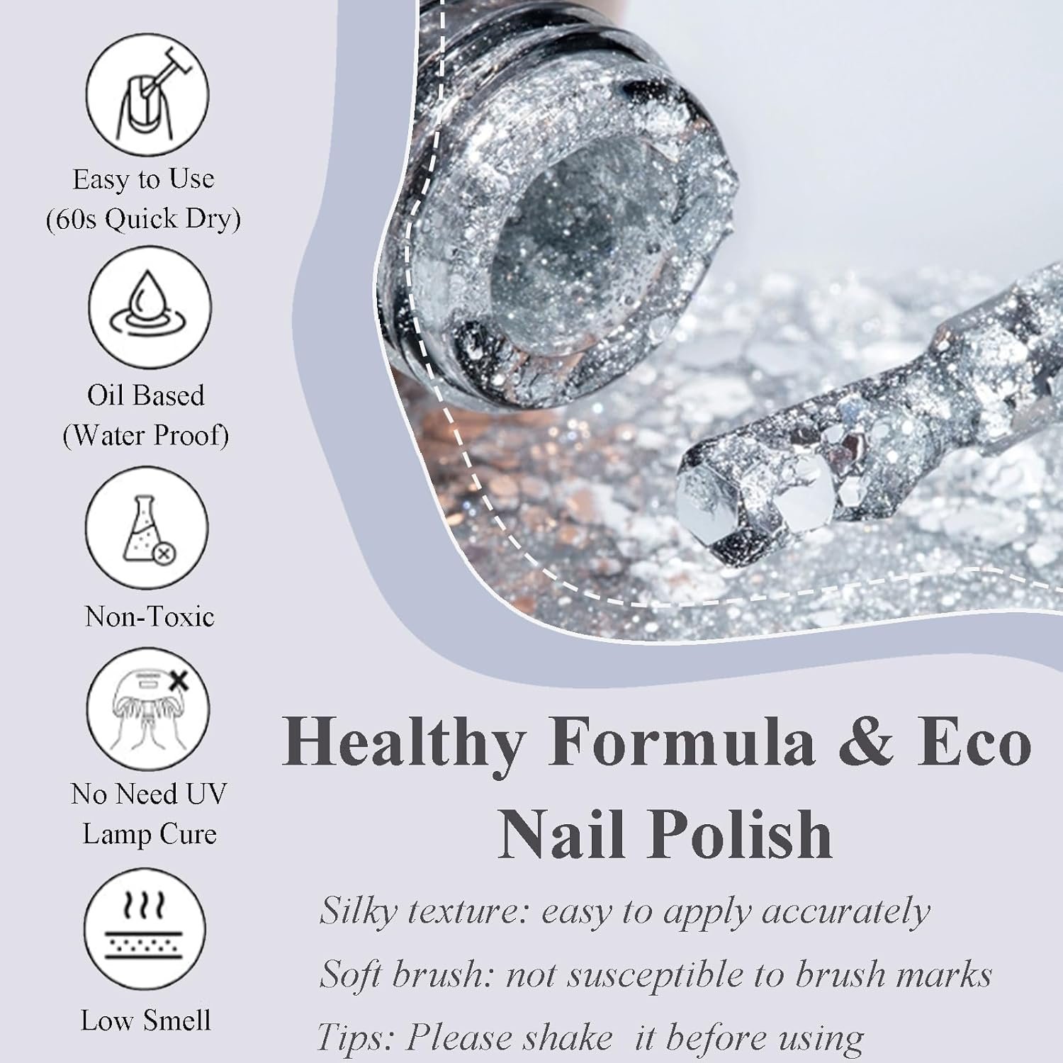 【7-10DAYS LONG WEAR NAIL POLISH】This sparkle nail polish glitter is waterproof and no easy to peel off. Compared to other fingernail polish, this clear sparkle nail polish does not easy to flake and lasts longer, it can last for 7+ days with perfect shine under proper application