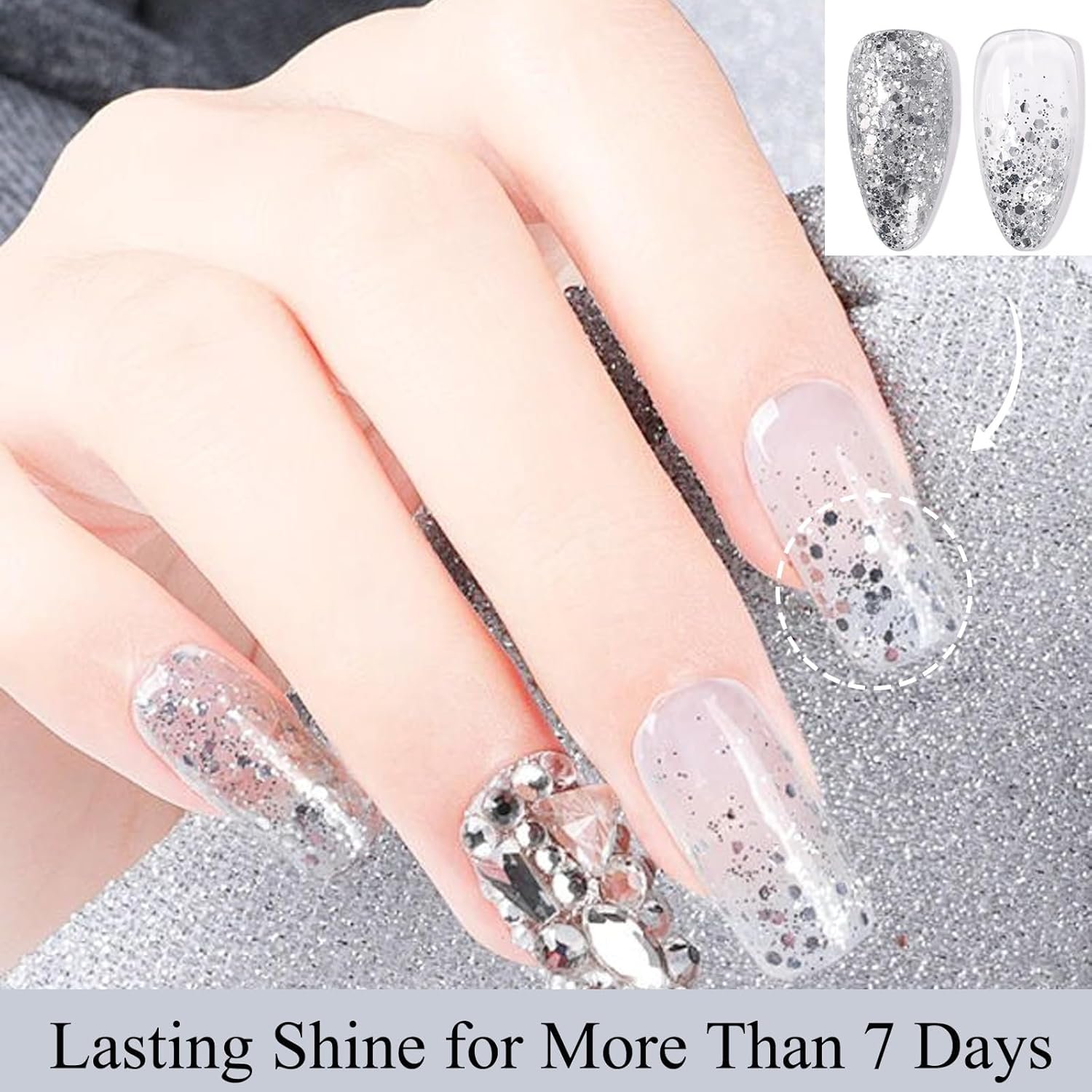 【SILVER GLITTER NAIL POLISH】 This silver sparkle nail polish can be used alone or in combination with other color gels. The clear glitter nail polish creates a diamond-like sparkle on your fingers. The ability to have holographic reflected light under light exposure will surprise you