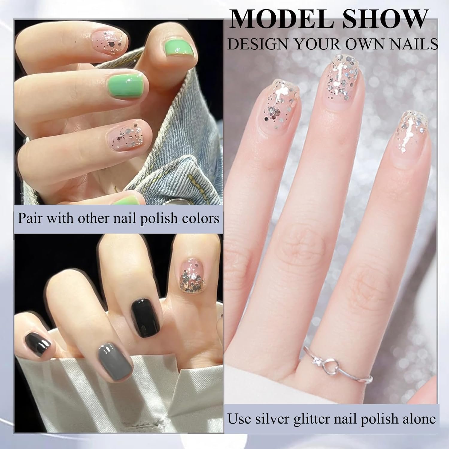 【EASY APPLICATION 】Smooth texture, even glitter, soft brush with large coverage. Thoughtful design makes it easy to apply this silver glitter polish to give your nails a shiny, luxurious look