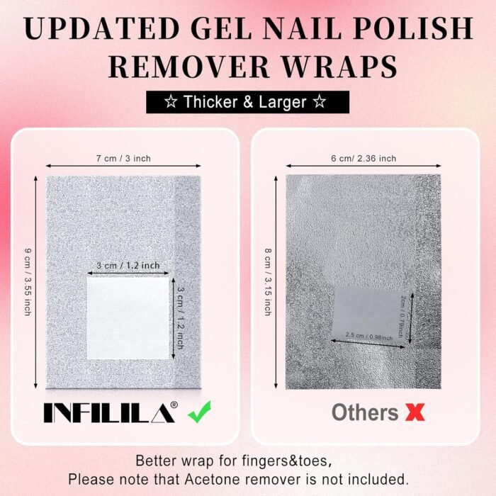 CONVENIENT&TIME-SAVING: Pre-cut aluminum NXJ INFILILA foil wraps work effectively in trapping heat to make the removal of gel polish efficient, fast, and easy. Just put a little acetone on the pad and wrap around nail/finger, wait a few minutes and the gel polish comes right off.
