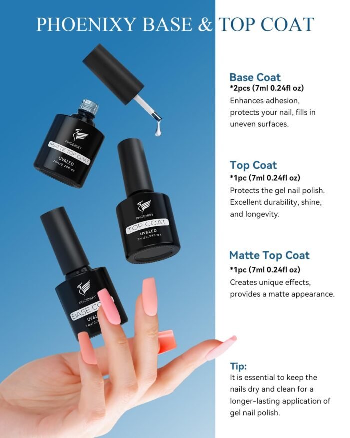 [72 Effects Of Colors] Phoenixy gel nail polish kit includes 7ml glossy top coat and 7ml matte top coat. You get two effects of color for the price of 1. You can switch the two effects at your leisure time without the hassle of going to a nail salon, saving your time and money.