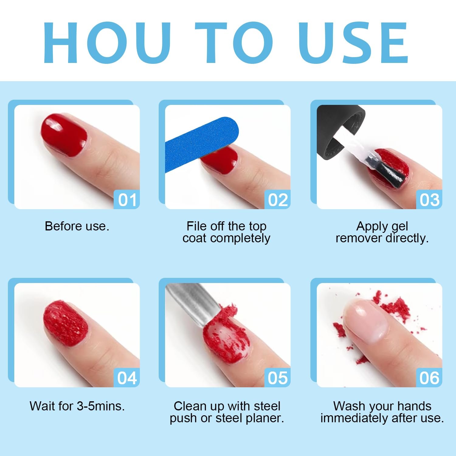 🍀【Simple Steps: 】HiLemon gel nail polish remover can easily remove gel polish on nails, just by brushing the remover onto your nails after filing off topcoat, and wait for 2-5 minutes. The gel polish will crack naturally, and then gently remove it with a small steel push. Effectively and quickly remove nail polish without cumbersome deletion process and long waiting, saving you time and money.