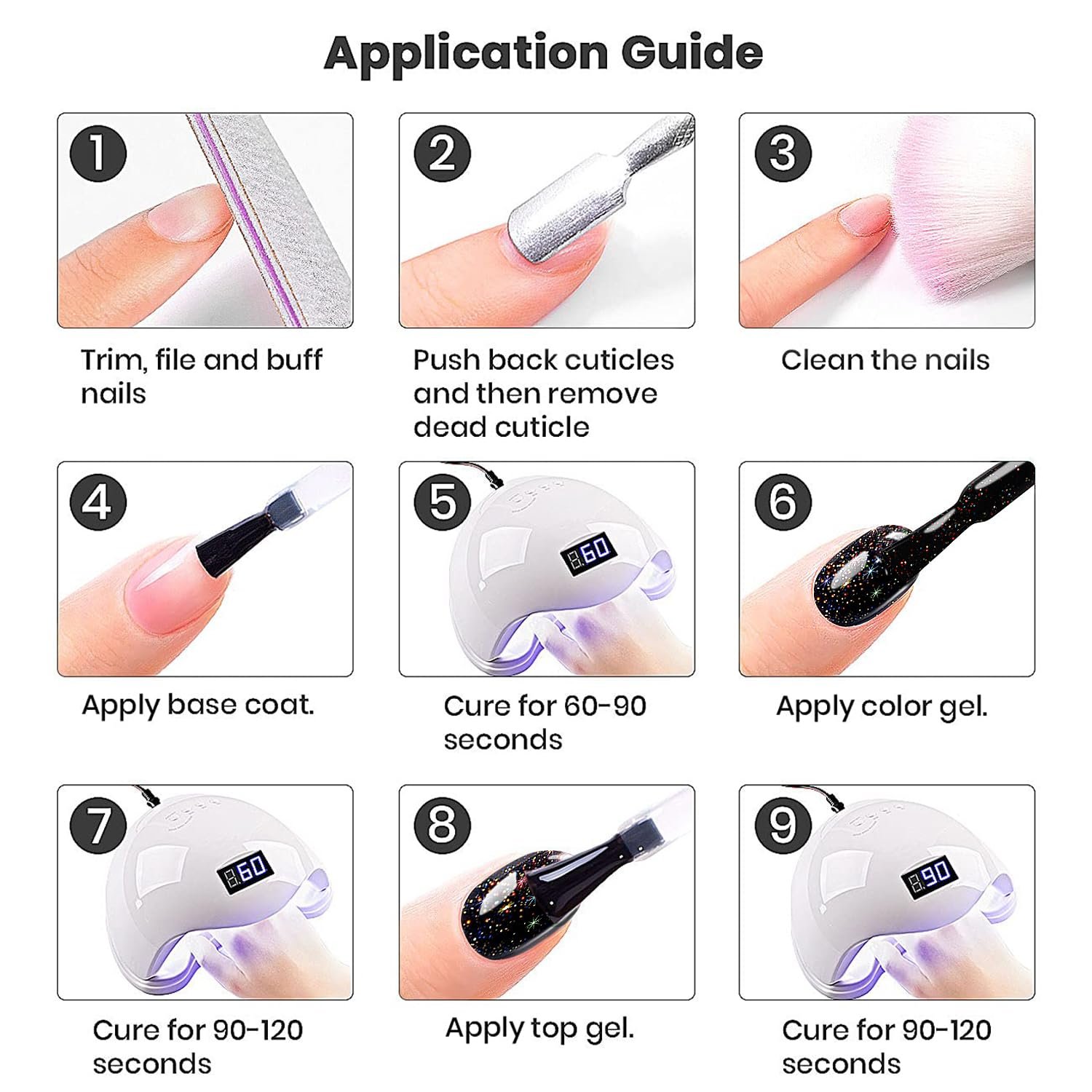 EASY APPLICATION LONG LASTING:This black glitter gel polish is long lasting for 21+ days with perfect shine under proper application. Highly recommend a minimum of 60 seconds with a LED light and 2 minutes with a UV lamp for each layer