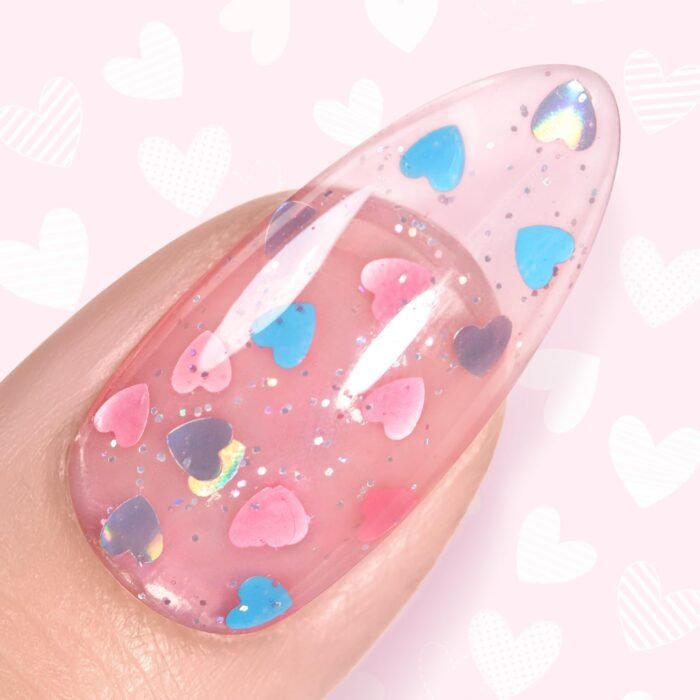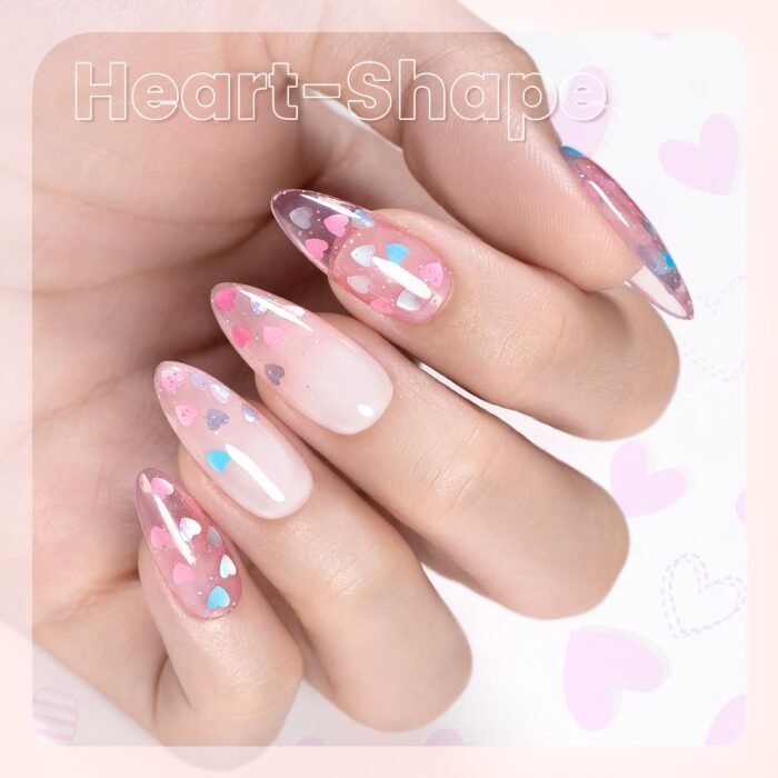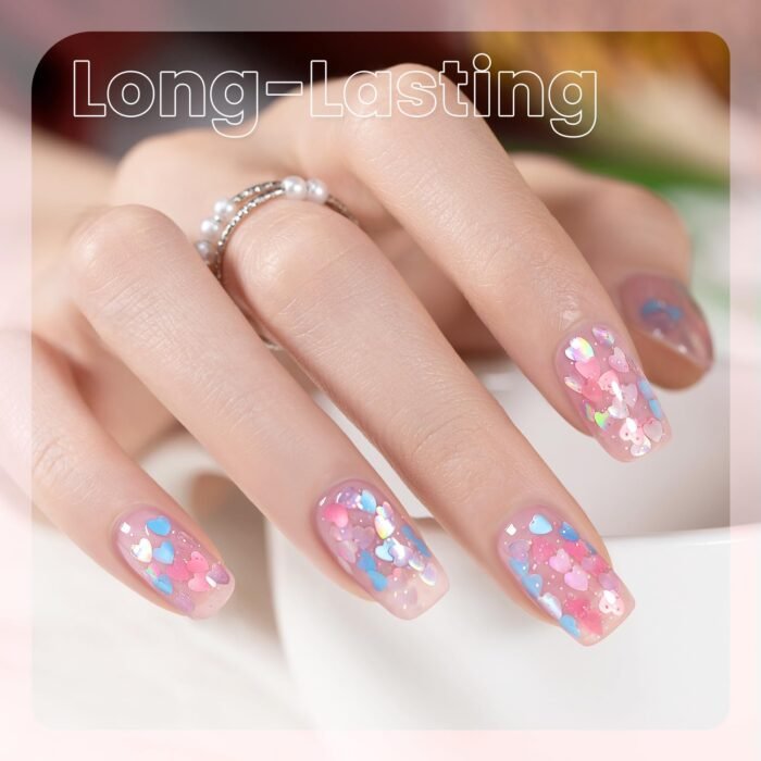 EASY TO APPLY FORMULA:The gel formula of nude jelly pink gel nail polish with heart shape big flake glitter that provides a long-lasting and chip-resistant manicure. It adheres well to the nails and can withstand daily activities