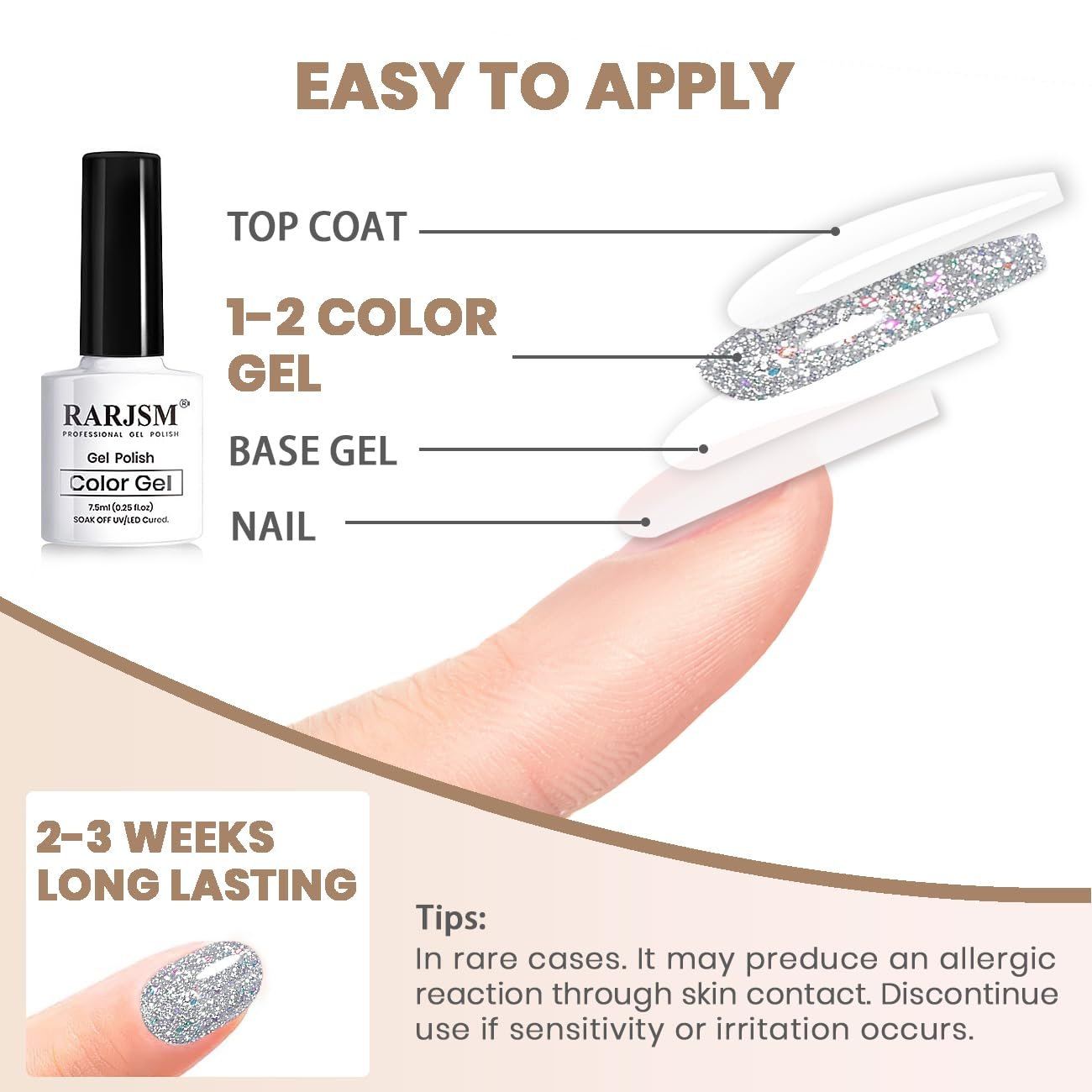 Easy Application and Long Lasting: The RARJSM reflective glitter gel is easy to apply. It applies with the base coat and the top coat can keep long lasting for at least 21 days with perfect shine under the proper application. Remember to polish the nail surface to increase the adhesive force to the nail surface and keep it dry before using the gel polish. It needs to be cured under the nail lamp