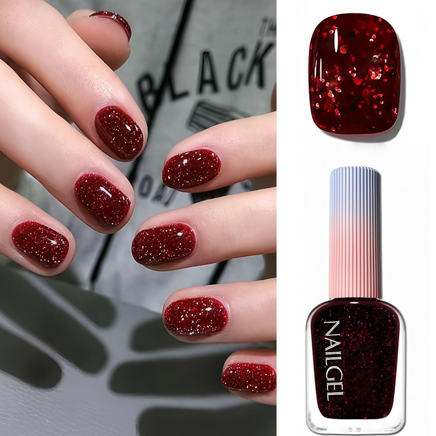 Sparkly Wine Red Shade】This red glitter nail polish features a rich burgundy red base filled with fine glitter for a glamorous, eye-catching manicure that shines in any light