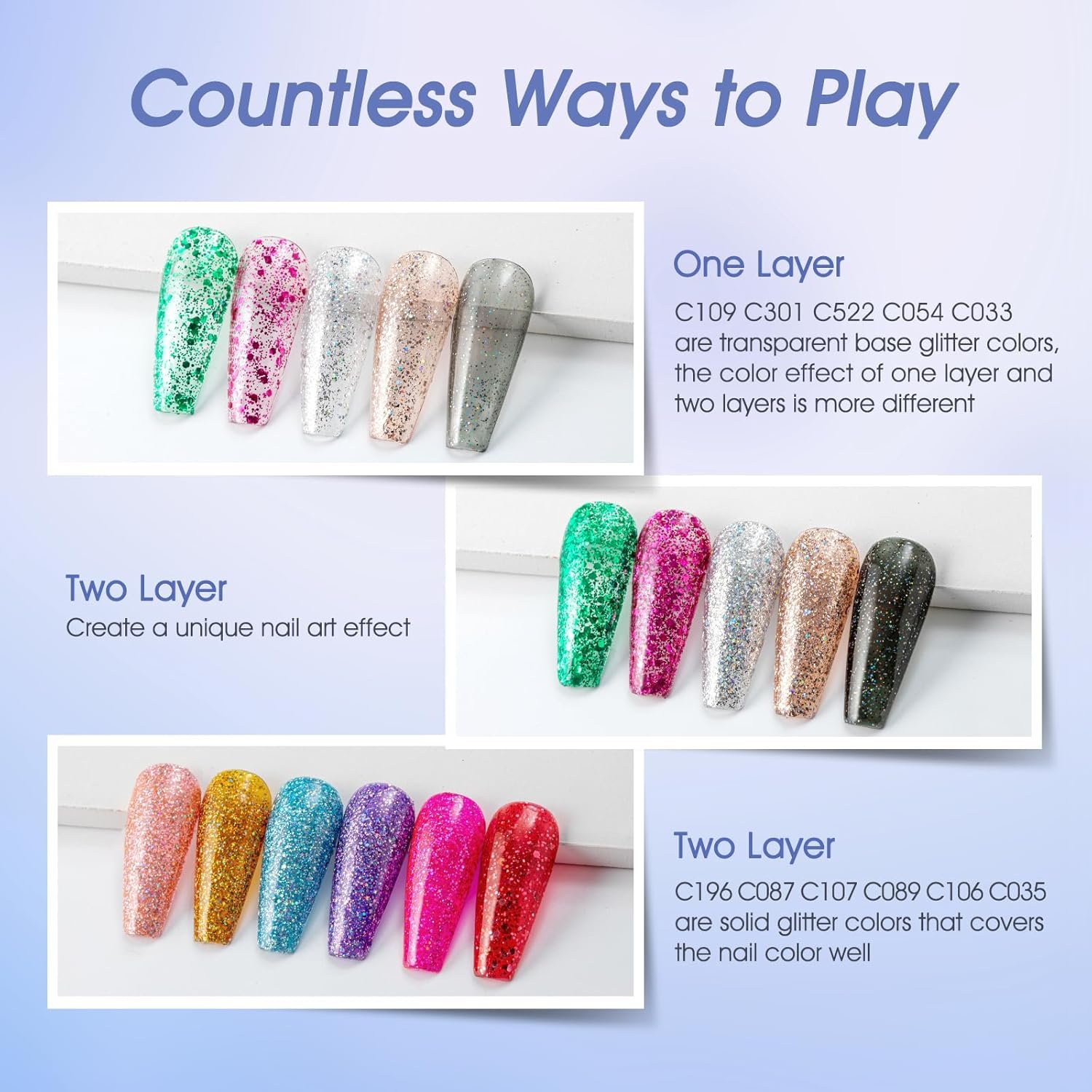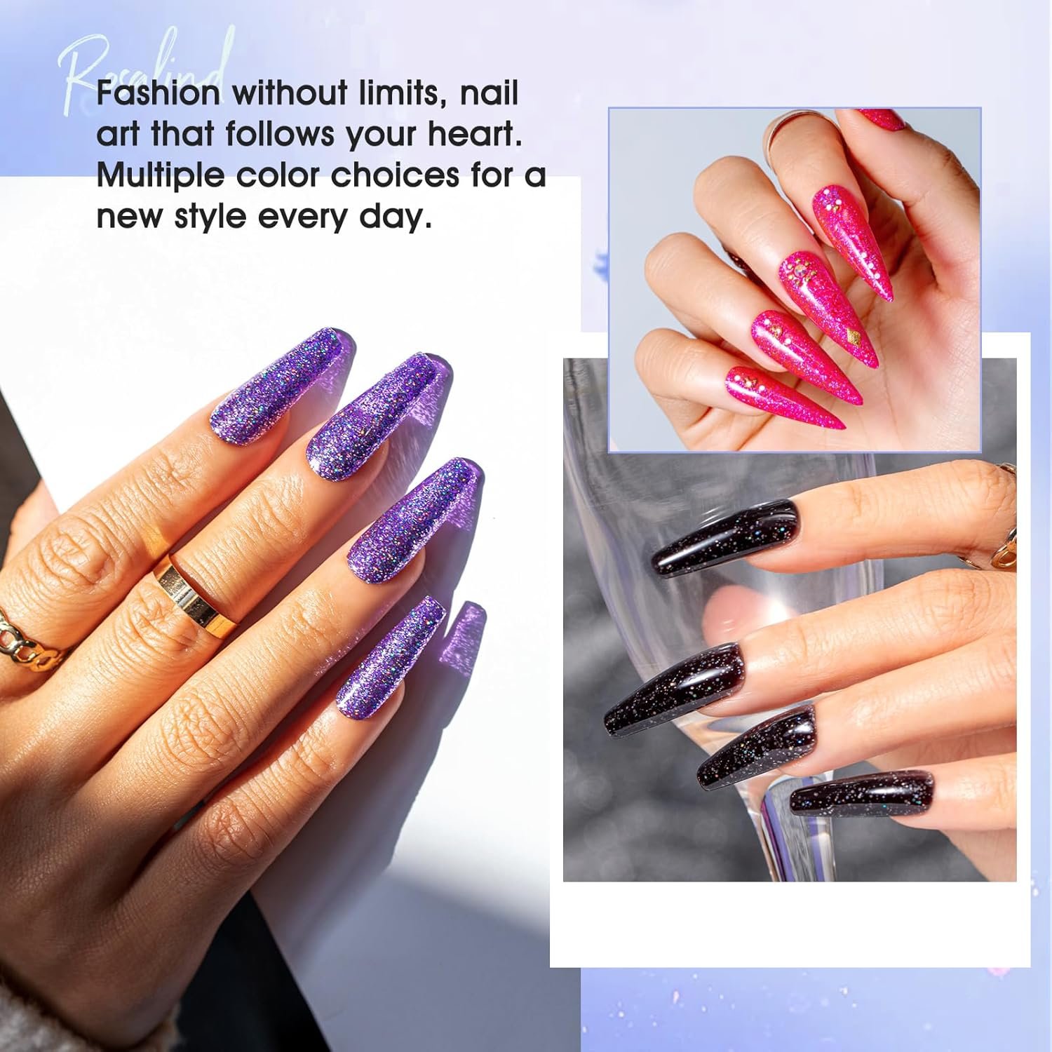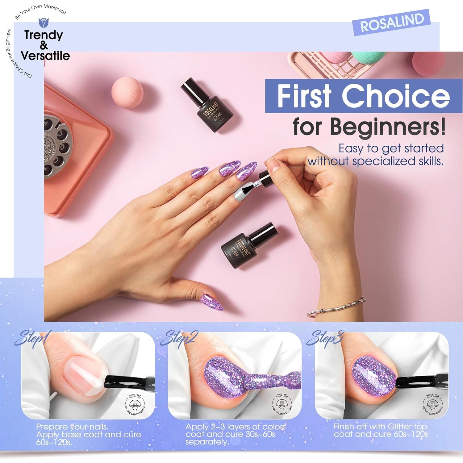 EASY TO APPLY & CARE: ROSALIND uv gel nail polish only need to work with the gel base top coat nail polish to get a perfect nail art. First, apply the base coat, then coated with glitter gel polish, and finally coated with gel top coat. Each step of the operation requires LED lamp curing for 120 seconds. Tips: This item does not include a base & top coat, which needs to be purchased separately