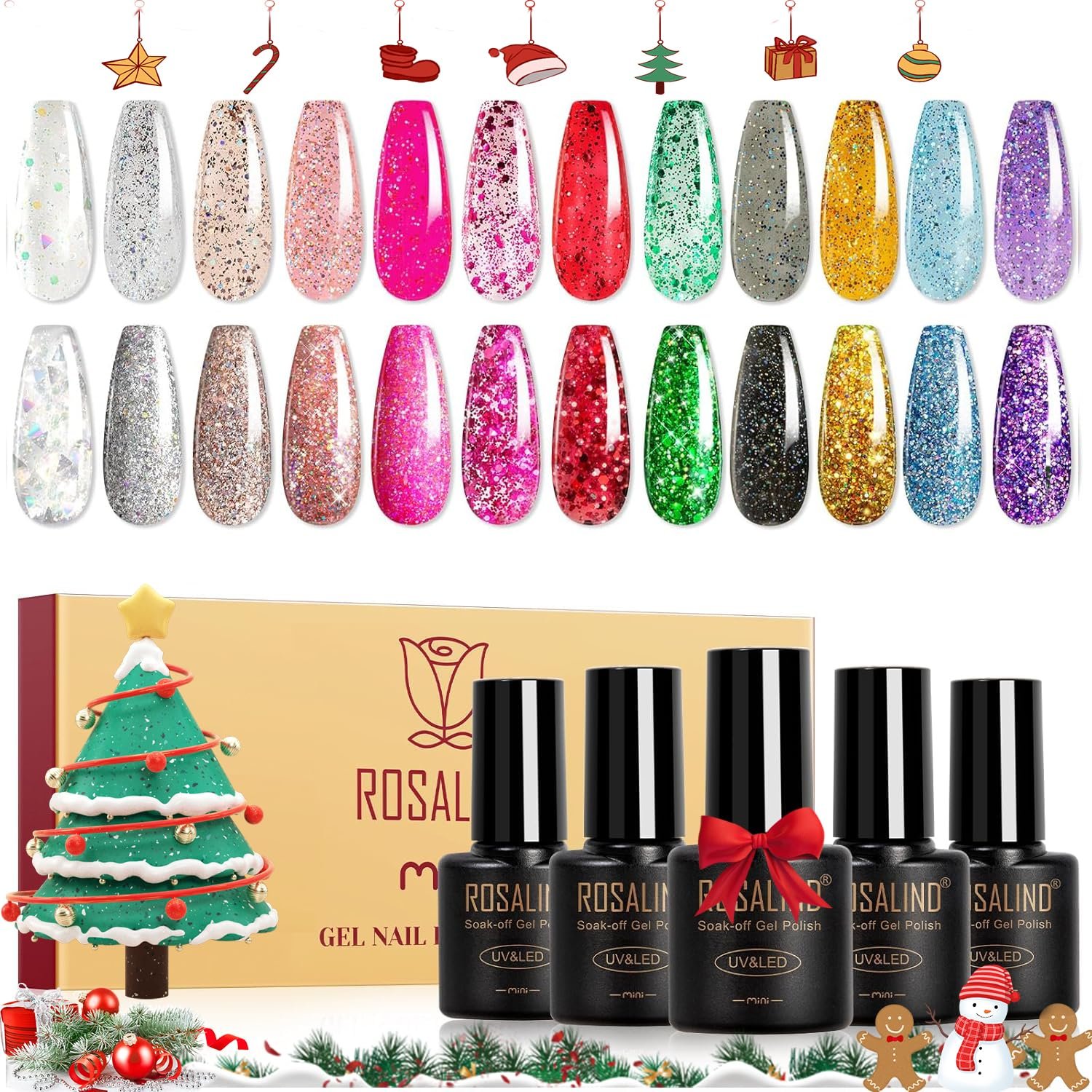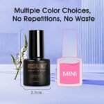 GLITTER GEL NAIL POLISH: ROSALIND glitter nail polish includes 12 glitter colors(Mini bottles, 5ml/0.17fl.oz). Each bottle of nail polish gel is 5.6cm (2.2in) high and 2.7cm (1.06in) long. The small bottle is easy to store and carry when going out