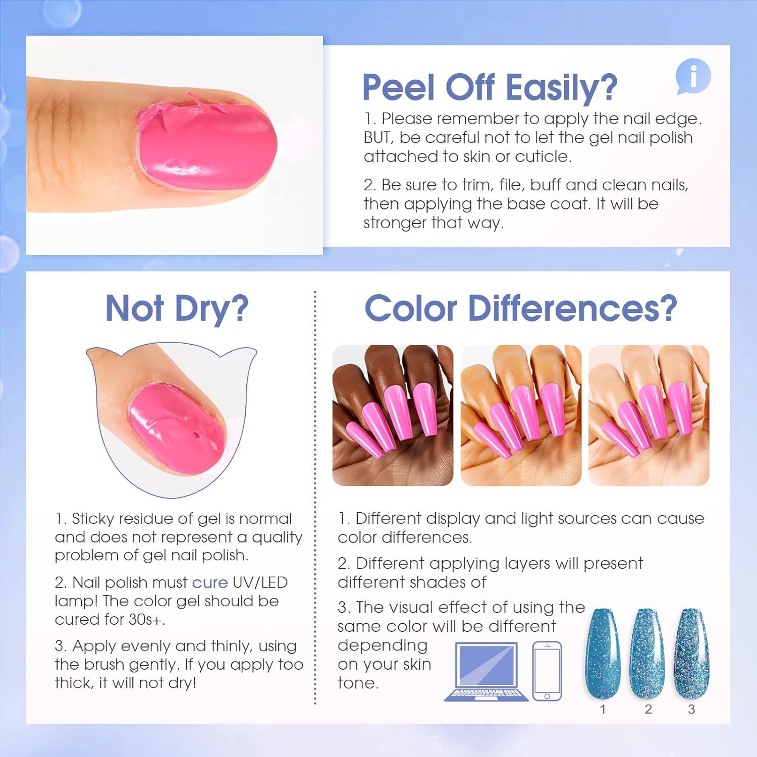 WARM TIPS: Buff your nail bed lightly before applying to prevent early peeling off. Dark colors(such as black) can appropriately extend the lighting time to 180 seconds. If you feel a burning sensation during curing, it is recommended to remove your hand from the lamp. Resume curing once the sensation returns to normal