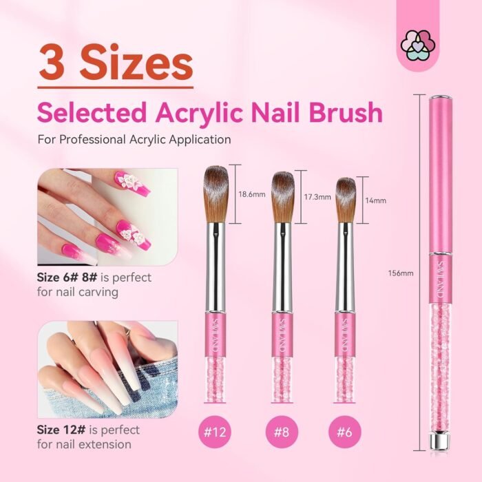 Versatile Sizes: Saviland offers a acrylic brush set of 3 professional acrylic nail brushes in sizes 6, 8, and 12 for precise acrylic powder application. The smooth and comfortable handles are full of decorations, adding much fun to your manicure process