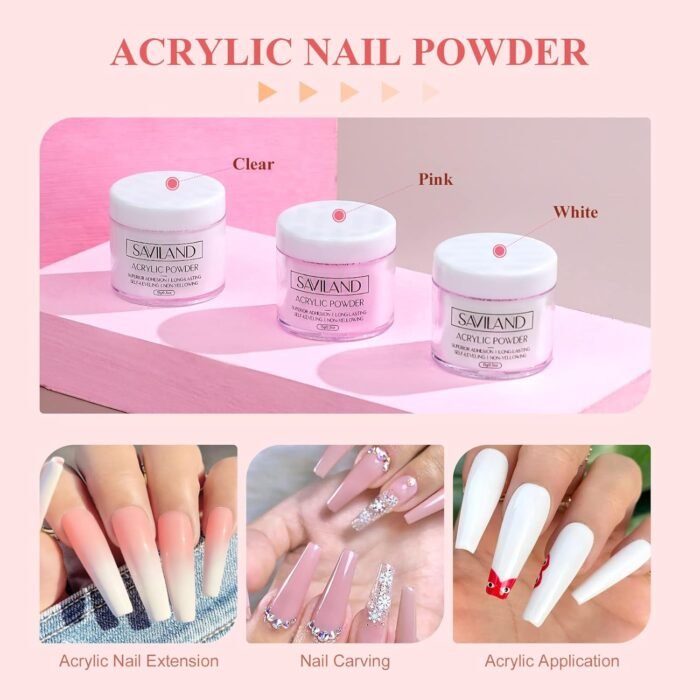 Non-Yellowing Formula for Natural-Looking: The acrylic nail kit acrylic powder includes 3 colors (clear, white and pink), developed with a non-yellowing formula, bubble-free polymers, providing flawless consistency, superior adhesion, and exceptional strength to your acrylic nails, giving them a natural-looking finish.