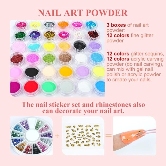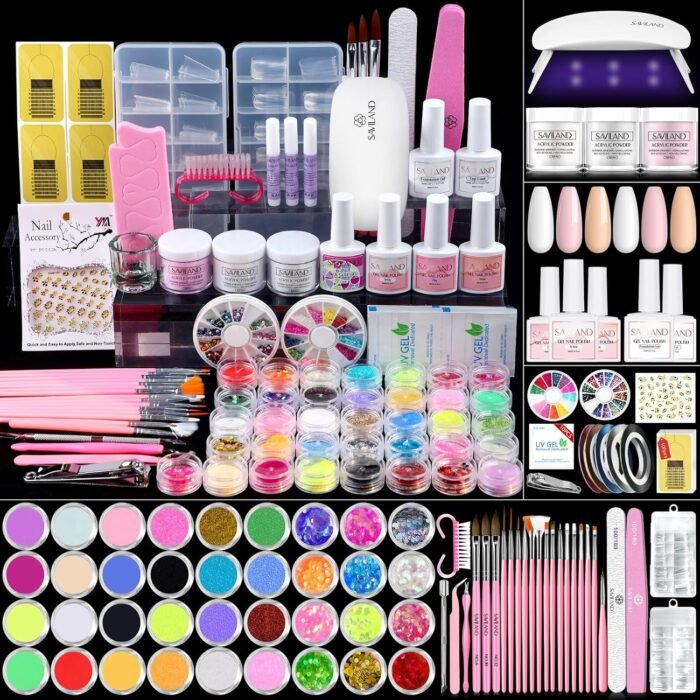 Saviland Acrylic Nail Kit with U V Light: Our acrylic nail kit with everything for beginners to create beautiful acrylic nails, including 3 colors acrylic powder, 36 colors glitter powder, gel nail polish, and other basic acrylic nail art tools, nail kit set professional acrylic with everything, ideal for both professional nail technician and DIY nail starter lovers.
