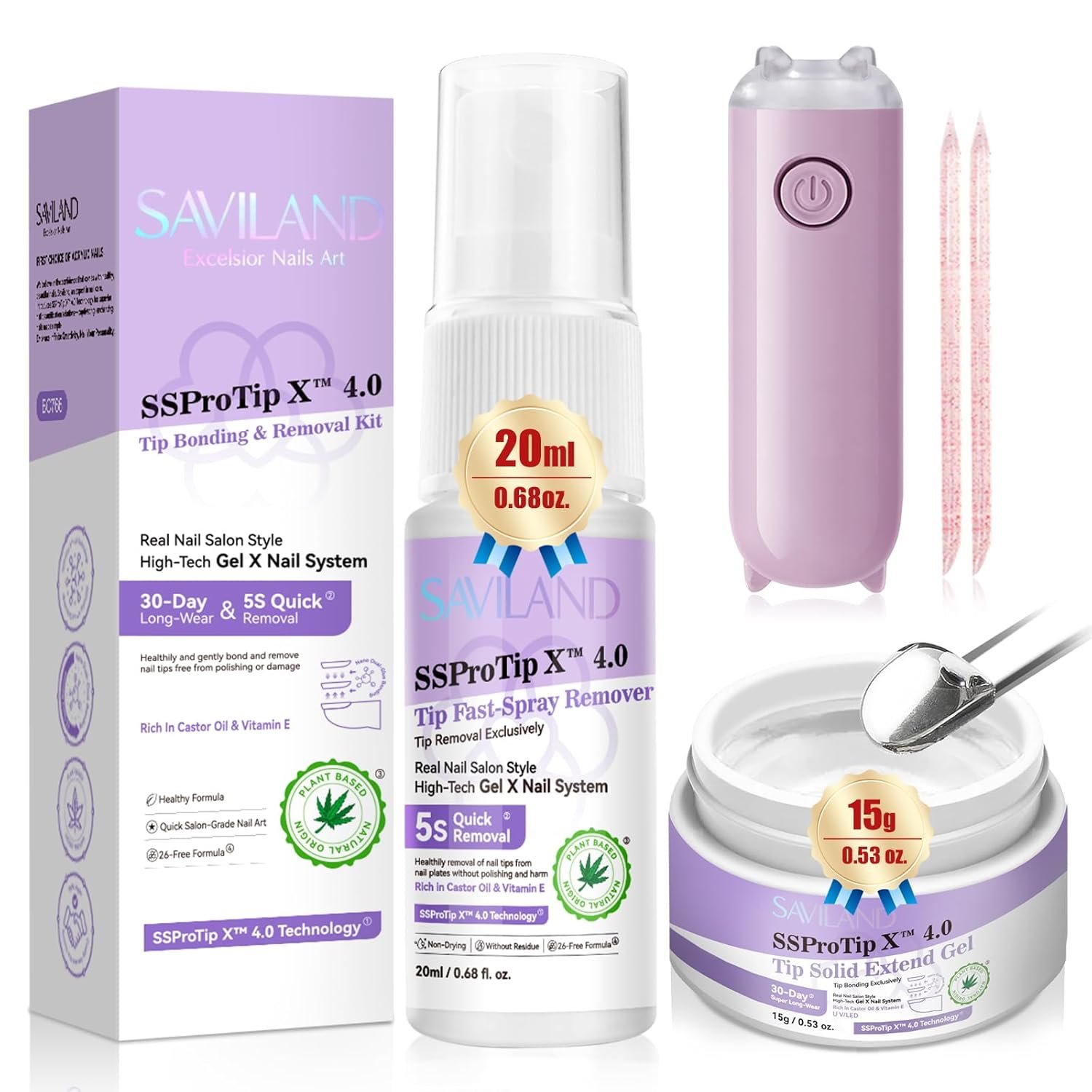 Complete Kit for Bond & Remove Press Ons: SAVILAND SSProTip X Solid Nail Glue Gel & Nail Glue Remover Kit include 1*Tip Solid Nail Glue Gel, 1*Solid Nail Gel Remover, 1*Mini Nail Lamp and 2*Nail Stick. One convenient kit for both adhesion and removal, eliminating the need for additional purchases. Suitable for studio, home, nail art teaching, and other scenarios.