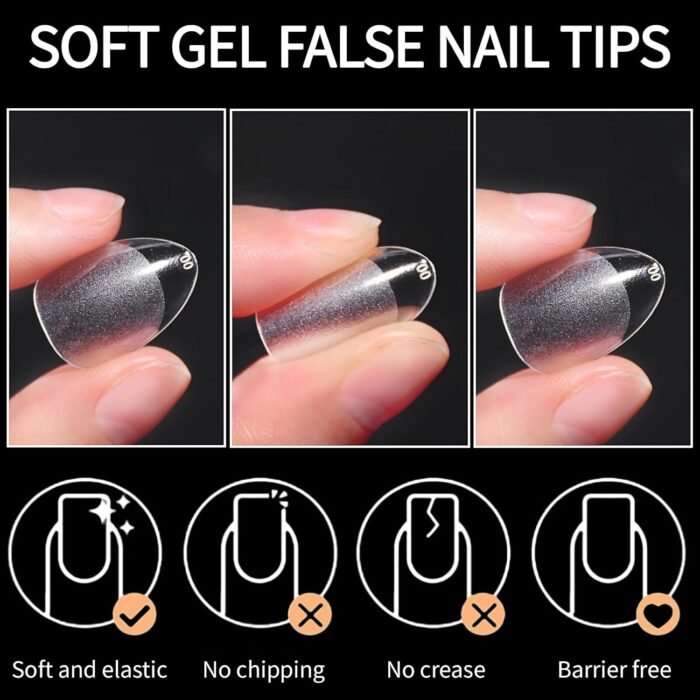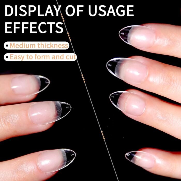 Professional Almond Shape Tips: Great extension Almond fake tips show a great clear cover with high-quality innovative material soft gelly tips can be used with nail polish, dip powder, and acrylic powder, easily making a salon nail effects instead of dropping money at an expensive salon!