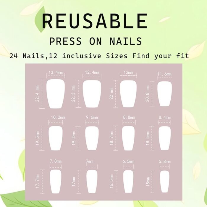 Package includes: 24 pcs coffin press on nails short , 24 pcs jelly glue stickers, 1 nail file, 1 wooden stick, 1 alcohol pad, the fake nails are available in 12 different sizes, so it is convenient for you to choose the one that fits your nails