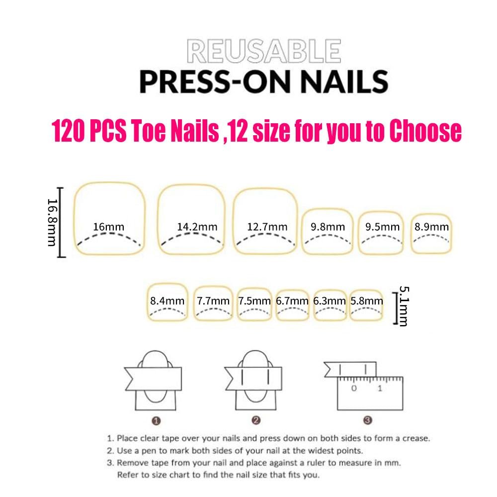 False Nails Tip Size: 12 sizes 120 pieces in total for your choice to replac fit toe nails better.(Note: please measure whether the size is suitable for your toenails tips before buying)