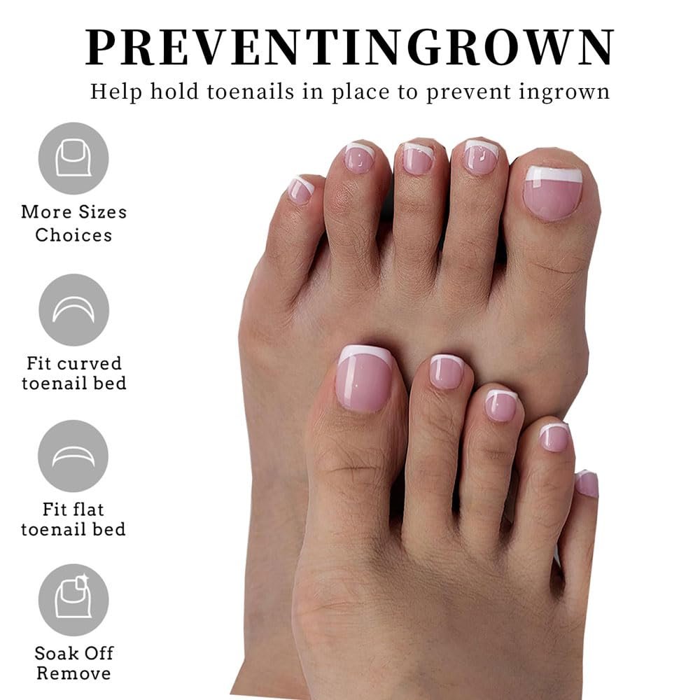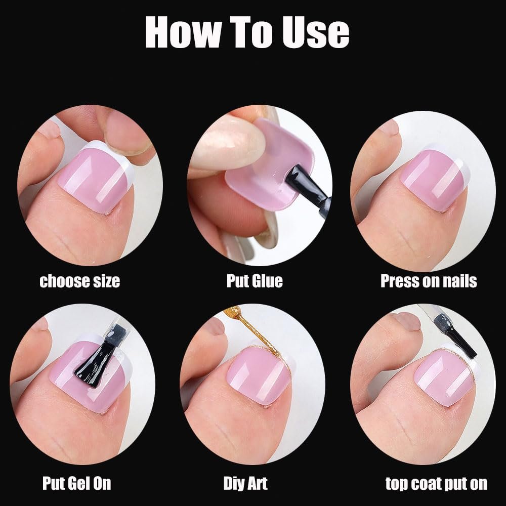 Innovative French Toe Nail Tips Design:Pre-designed french tip press on toenails for women,Contours to the toenail perfectly from cuticle to free edge. Each toenail tip features a tapered fit towards the cuticle to give you the most natural look! Create a light-cured, pre-shaped nail enhancement in 5 minutes or less