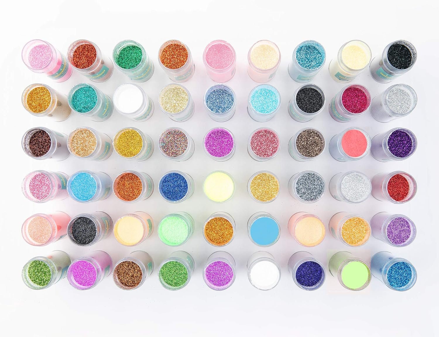 Luxury Extra Fine Glitter Kit: This glitter set includes 54 colors, 5 holographic fine glitter colors, 3 glow glitter powder colors, 6 rainbow fine glitter colors, 8 fluorescent fine glitter colors and 32 extra fine glitter colors, the possibilities are endless, total net weight 540 g = 1.2 lbs, each bottle is 10 gram